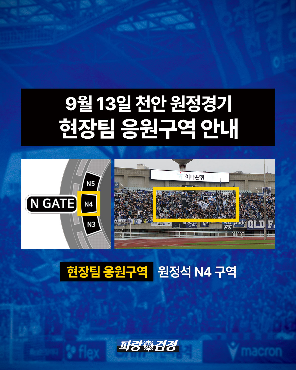 다가오는 9월 13일 천안 원정경기 현장팀 응원구역에 대해 안내해 드립니다.