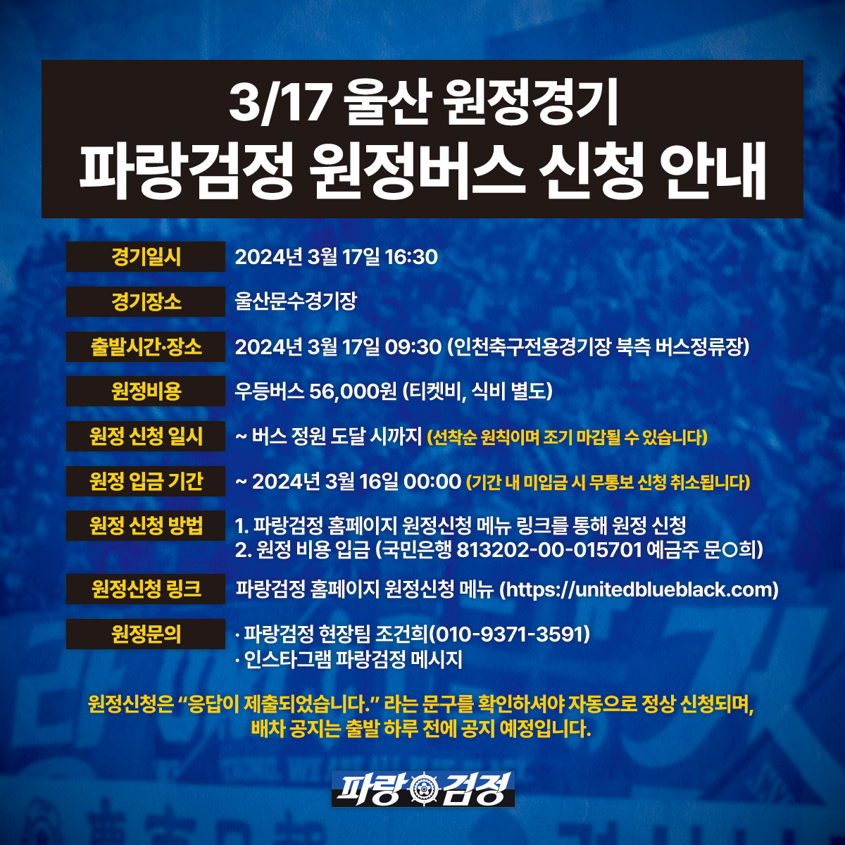 우리 인천유나이티드의 2024 K리그1 3R 울산 원정단을 모집합니다. 파랑검정 현장팀에서 운영하는 원정버스는 개인이 직접 신청, 입금이 확인되신 분들만 탑승하실 수 있습니다.
