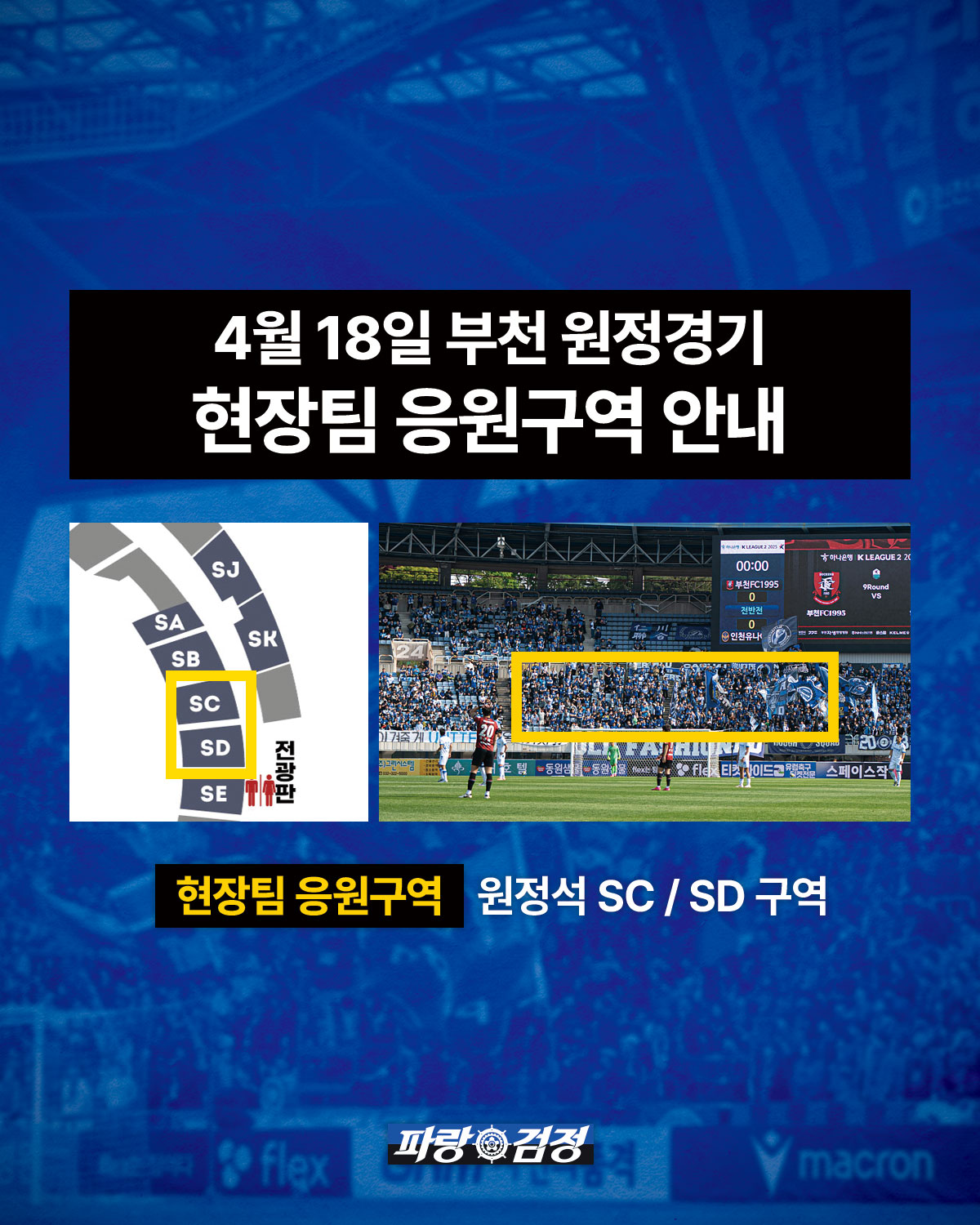 콜리더와 드럼을 비롯한 현장팀은 ‘원정석 SC/SD 구역' 중앙을 중심으로 응원을 진행할 예정입니다.해당 구역을 중심으로 현장팀의 악기, 깃발 등이 설치될 예정이오니 파랑검정 팬 여러분들의 많은 양해 부탁드리겠습니다.