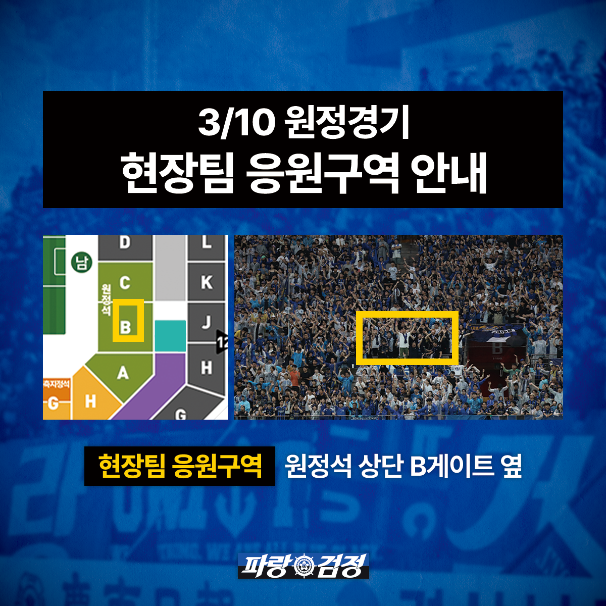 파랑검정 현장팀에서 다가오는 3월 10일 원정경기 현장팀 응원구역에 대해 안내드립니다.