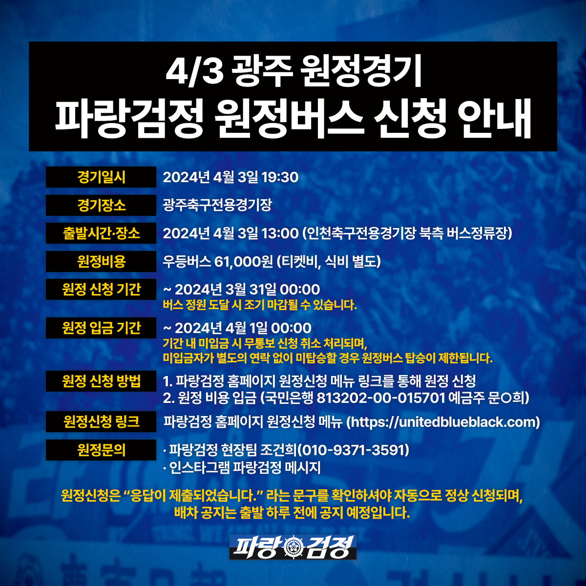 파랑검정 현장팀에서 운영하는 원정버스는 개인이 직접 신청, 입금이 확인되신 분들만 탑승하실 수 있습니다.