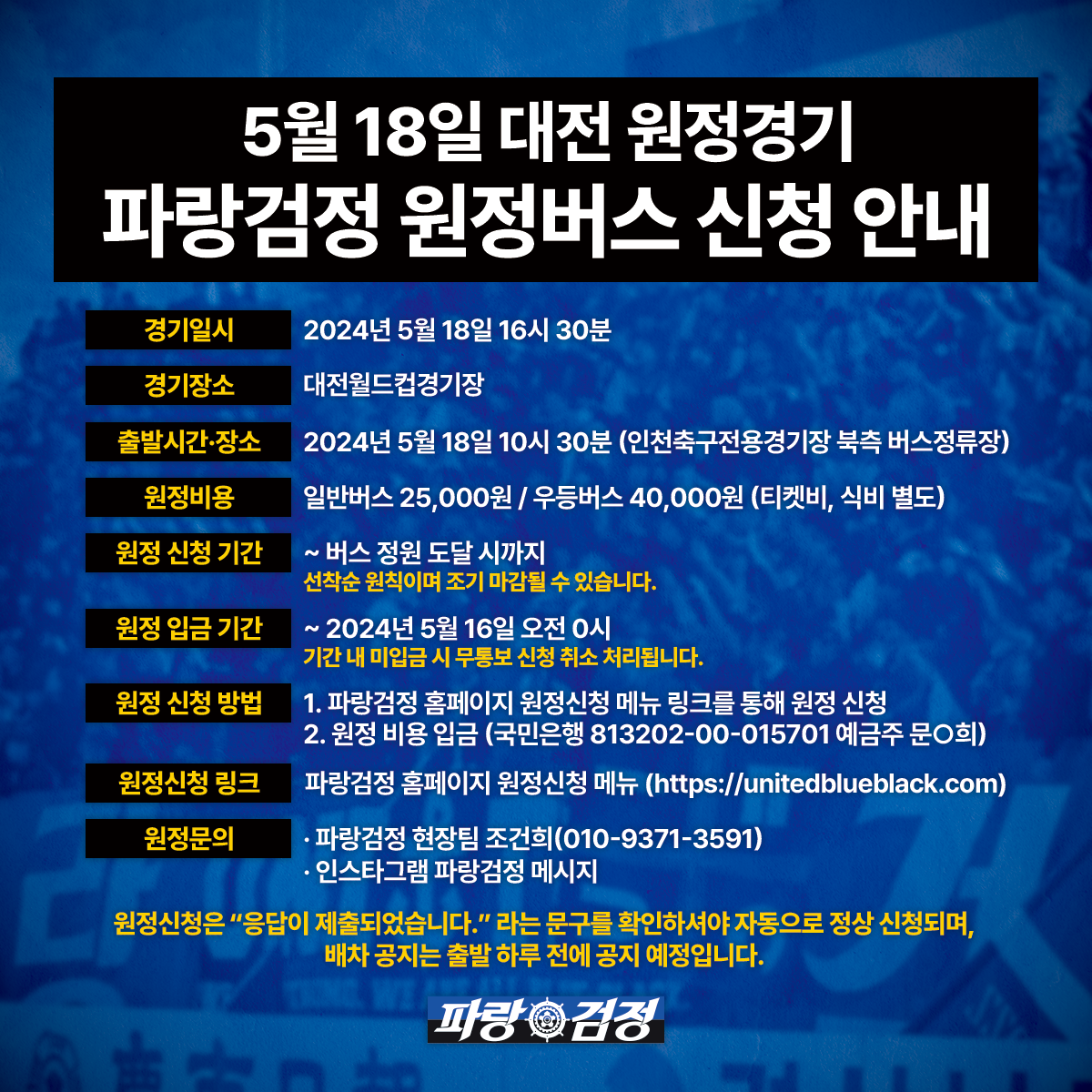 파랑검정 현장팀에서 운영하는 원정버스는 개인이 직접 신청, 입금이 확인되신 분들만 탑승하실 수 있습니다.