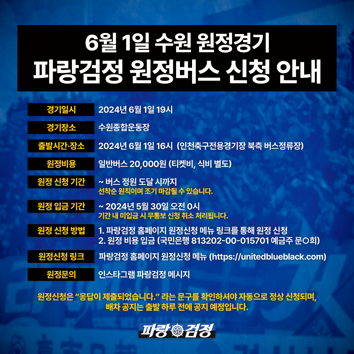 파랑검정 현장팀에서 운영하는 원정버스는 개인이 직접 신청, 입금이 확인되신 분들만 탑승하실 수 있습니다.