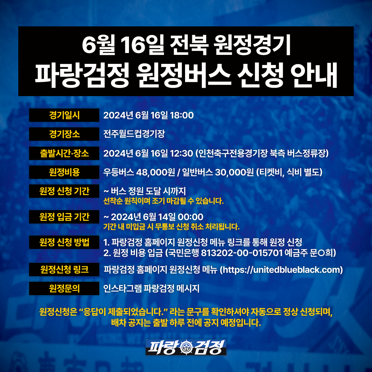 파랑검정 현장팀에서 운영하는 원정버스는 개인이 직접 신청, 입금이 확인되신 분들만 탑승하실 수 있습니다.