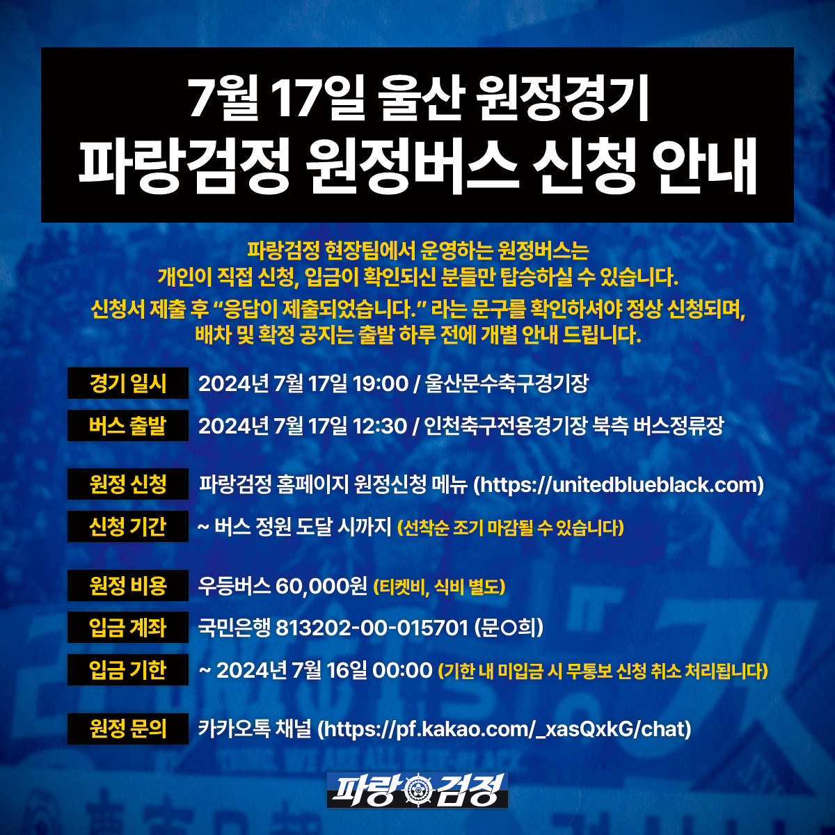 파랑검정 현장팀에서 운영하는 원정버스는 개인이 직접 신청, 입금이 확인되신 분들만 탑승하실 수 있습니다.