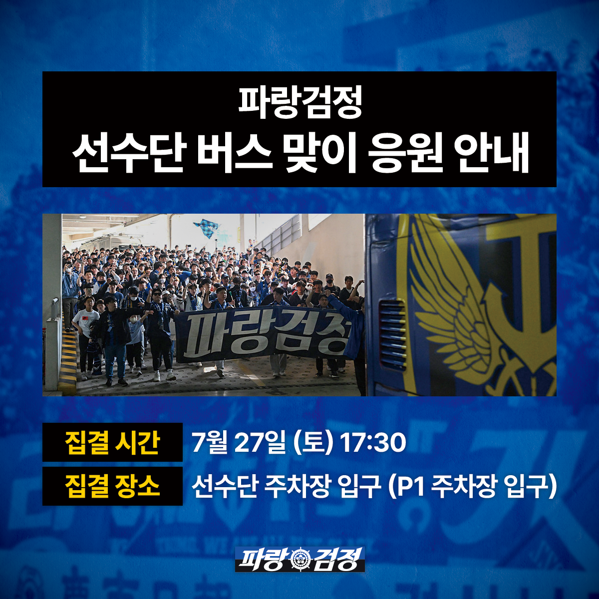파랑검정 현장팀에서는 7월 27일 홈경기에서 버스 맞이 응원을 진행합니다.