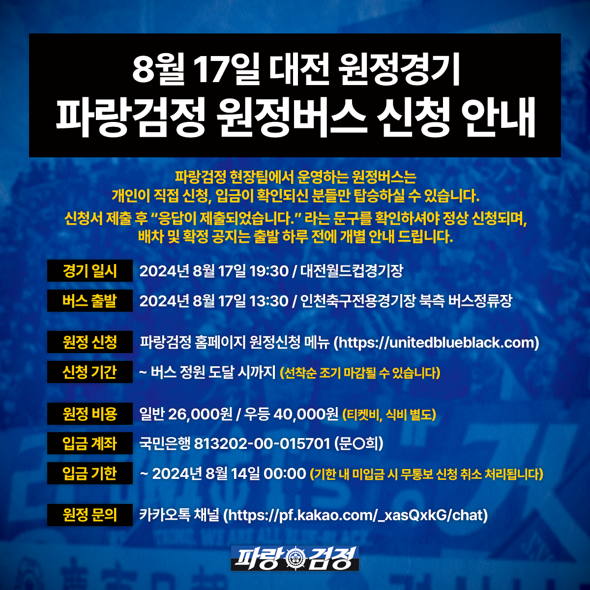 파랑검정 현장팀에서 운영하는 원정버스는 개인이 직접 신청하여 입금 확인되신 분들만 탑승하실 수 있습니다.