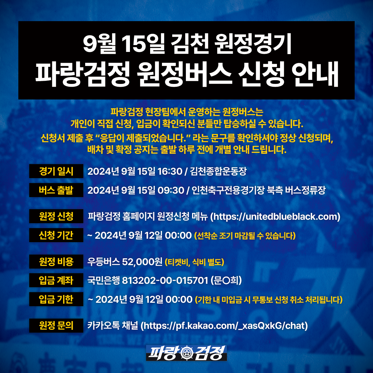 파랑검정 현장팀에서 알려드립니다. 우리 인천유나이티드의 2024 K리그1 30R 김천 원정단을 모집합니다.