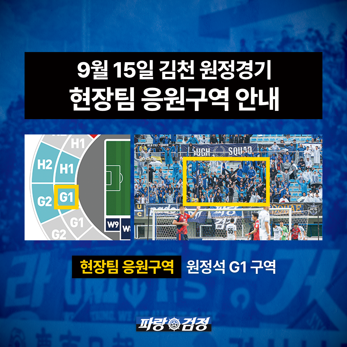 다가오는 9월 15일 김천 원정경기 현장팀 응원구역에 대해 안내해 드립니다.
