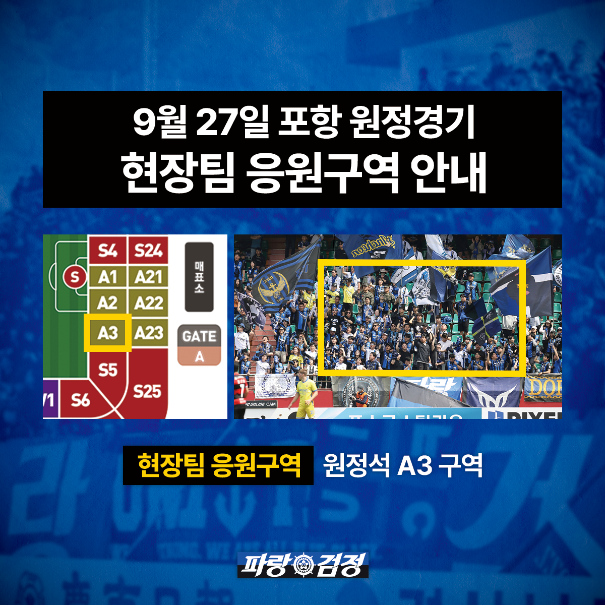 다가오는 9월 27일 포항 원정경기 현장팀 응원구역에 대해 안내해 드립니다.