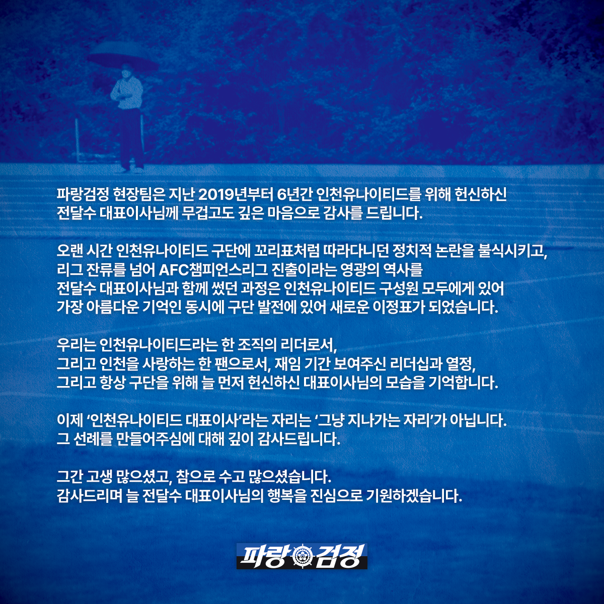 파랑검정 현장팀은 지난 2019년부터 6년간 인천유나이티드를 위해 헌신하신 전달수 대표이사님께 무겁고도 깊은 마음으로 감사를 드립니다.