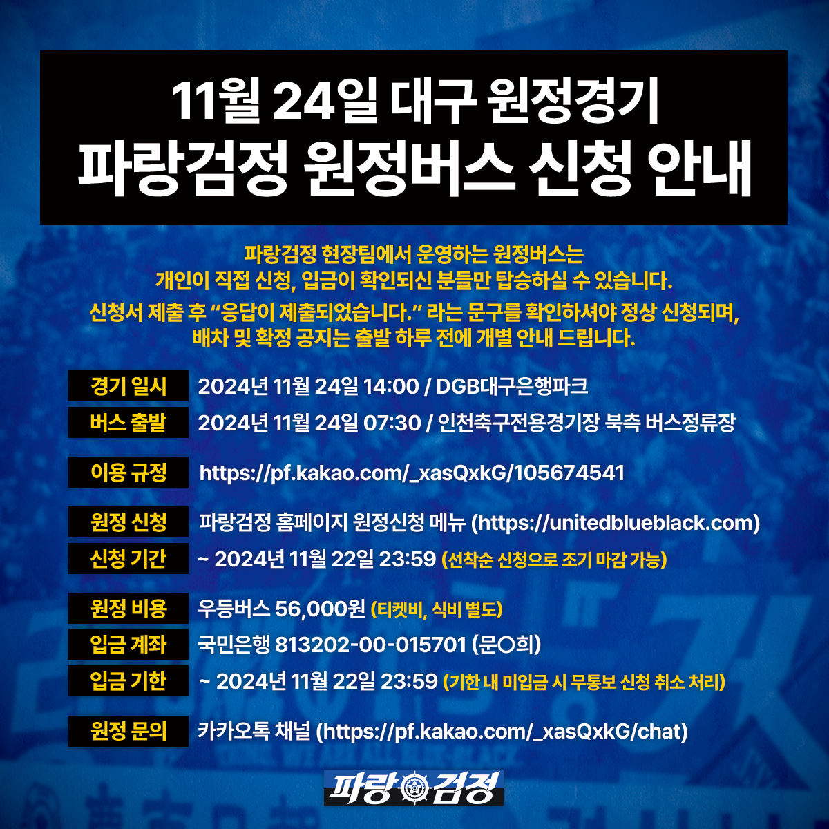 파랑검정 현장팀에서 운영하는 원정버스는 개인이 직접 신청, 입금이 확인되신 분들만 탑승하실 수 있습니다.