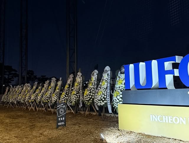 2024년 12월 22일 오후 7시 현재 약 50여개의 근조화환이 인천유나이티드 축구센터대로 주변으로 설치되었고 지금도 설치되고 있습니다.