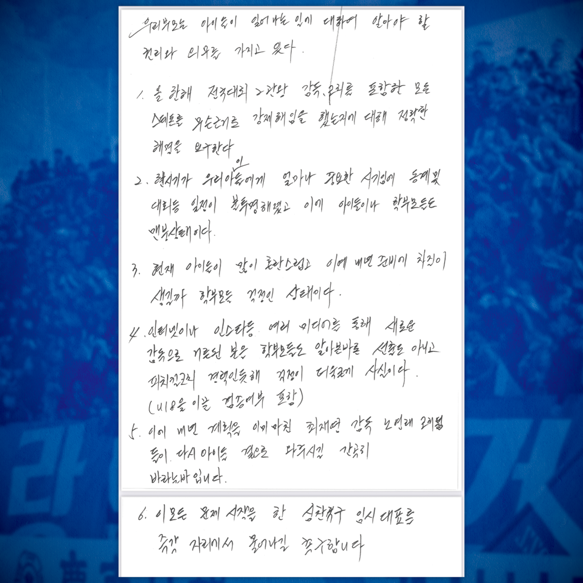 해당 문건은 전국대회 2관왕이라는 대업을 달성한 최재영 감독 및 코칭스태프의 강제해임에 대한 해명요구와 이로 인해 흔들리고 있는 현 U-18 대건고등학교 아들들의 미래에 대한 걱정, 그리고 최재영 감독 이하 코칭스태프 전원의 복귀와 심찬구 임시대표의 즉각해임을 요구하는 내용을 담고 있습니다. 현재 U-18 대건고등학교 학부모님들은 행동에 나서신 상태로 구단주인 인천광역시장과의 만남을 추진하고 계십니다.