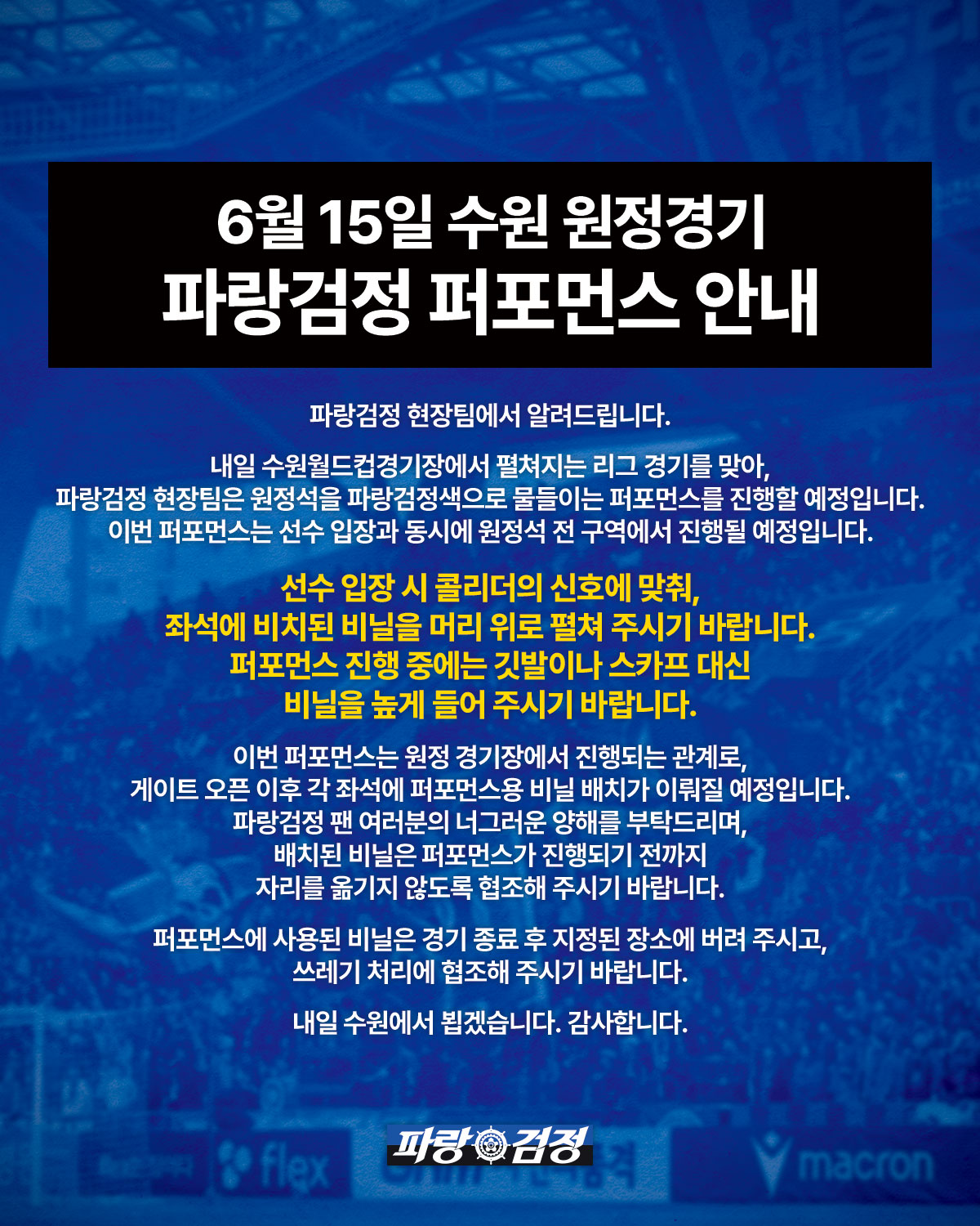 내일 수원월드컵경기장에서 펼쳐지는 리그 경기를 맞아, 파랑검정 현장팀은 원정석을 파랑검정색으로 물들이는 퍼포먼스를 진행할 예정입니다. 이번 퍼포먼스는 선수 입장과 동시에 원정석 전 구역에서 진행될 예정입니다.